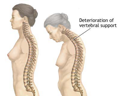 Osteoporosis may be noticeable in older as weak and fractured bones in the spine can cause the head to permanently lean forwards and a hunchback appearance developing.